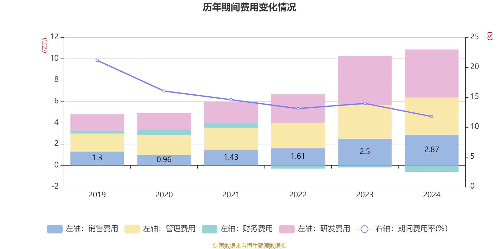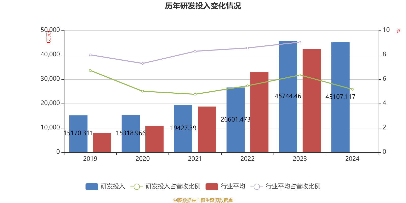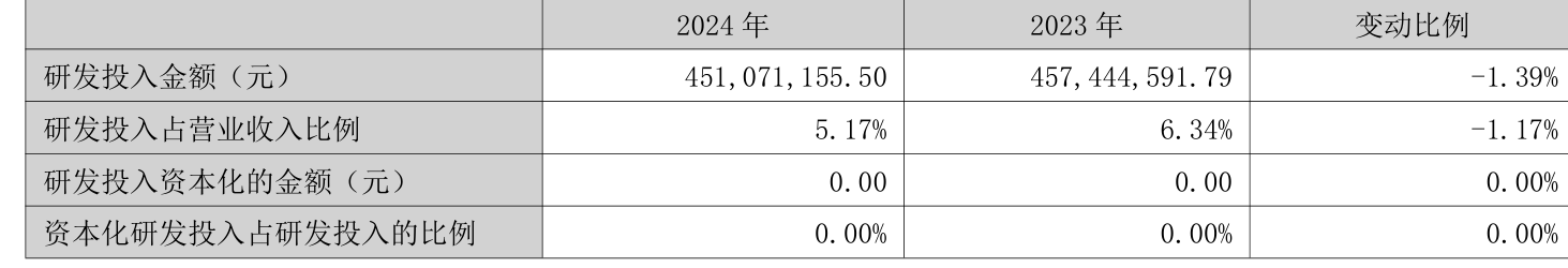 2024年全年,公司研发投入金额为4.51亿元国尚策略,同比下降1.39%;研发投入占营业收入比例为5.17%,相比上年同期下降1.17个百分点。此外,公司全年研发投入资本化率为0%。