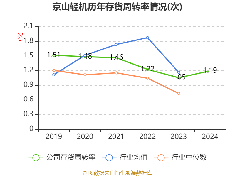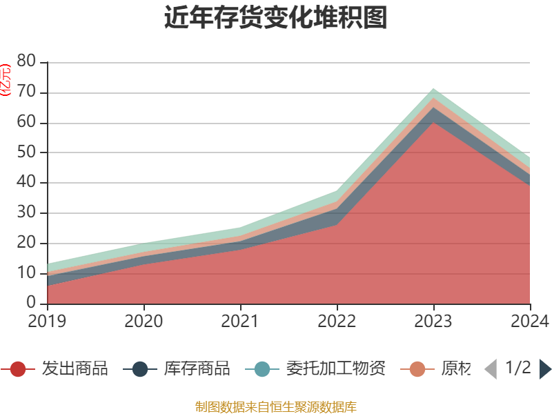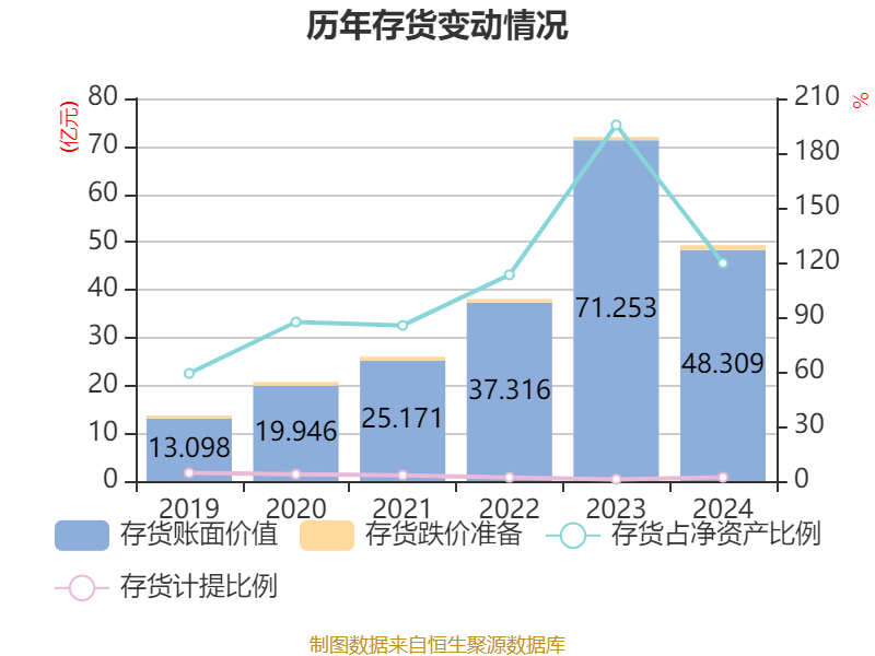 从存货变动来看,截至2024年末,公司存货账面价值为48.31亿元,占净资产的119.57%,较上年末减少22.94亿元。其中,存货跌价准备为1.02亿元,计提比例为2.06%。