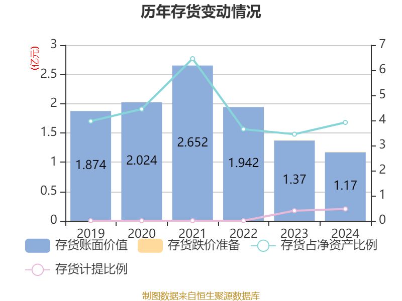 从存货变动来看,截至2024年末,公司存货账面价值为1.17亿元,占净资产的3.92%,较上年末减少1992.72万元。其中,存货跌价准备为55.52万元,计提比例为0.47%。