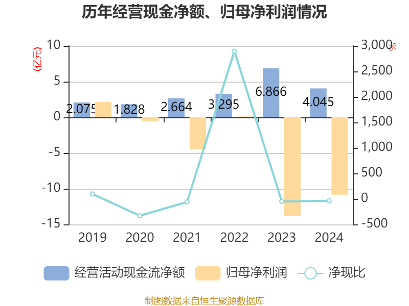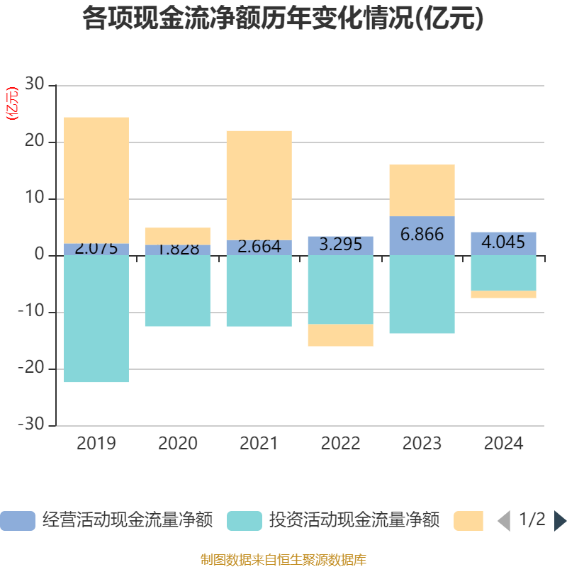截至2024年,公司经营活动现金流净额为4.04亿元,同比下降41.09%;筹资活动现金流净额-1.27亿元,同比减少10.38亿元;投资活动现金流净额-6.29亿元,上年同期为-13.8亿元。