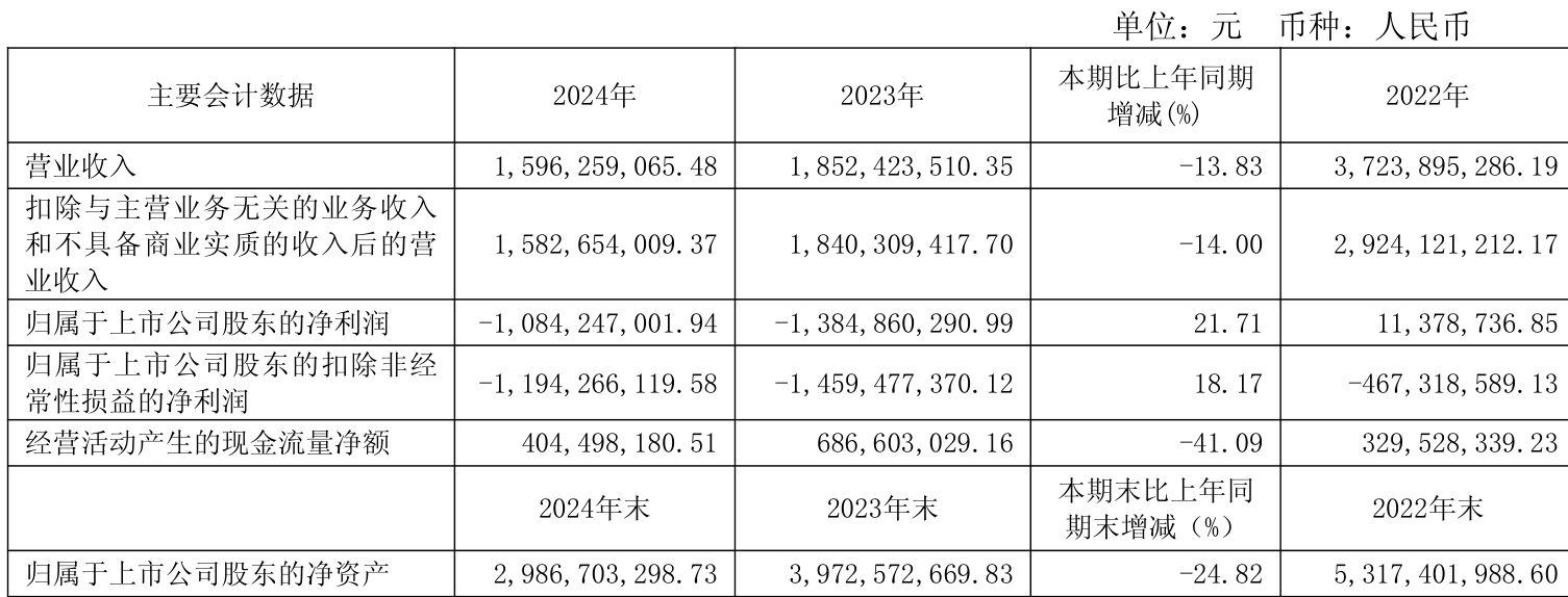 中证智能财讯贵广网络(600996)4月26日披露2024年年度报告。2024年,公司实现营业总收入15.96亿元,同比下降13.83%;归母净利润亏损10.84亿元,上年同期亏损13.85亿元;扣非净利润亏损11.94亿元,上年同期亏损14.59亿元;经营活动产生的现金流量净额为4.04亿元,同比下降41.09%;报告期内,贵广网络基本每股收益为-0.89元,加权平均净资产收益率为-27.22%。
