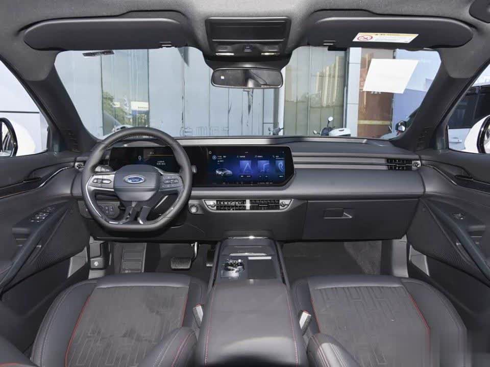 车内座椅采用了仿皮材质,包覆感很强,触感也很柔软。中控配备由12.3 英寸全液晶仪表盘与 27 英寸中控大屏组成的1.1 米的超广域高清巨幅屏,车机搭载的是SYNC+ 2.0智行互联系统,支持语音识别和控制,用起来还算流。