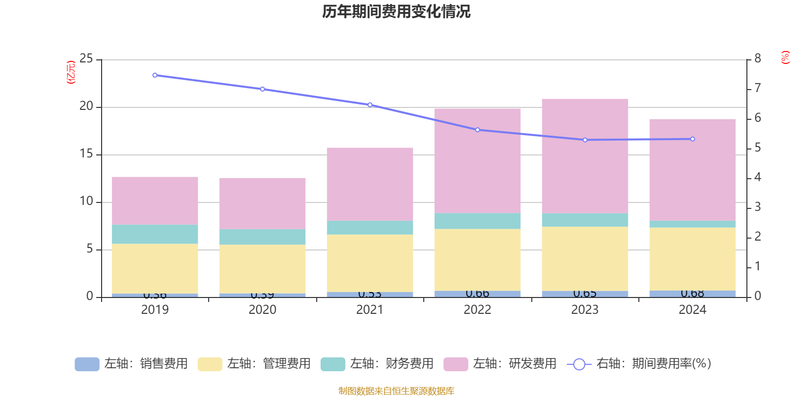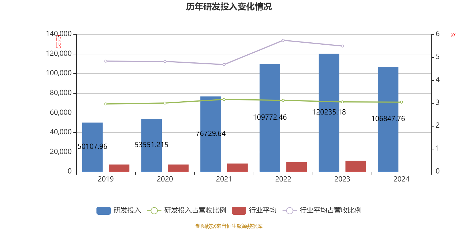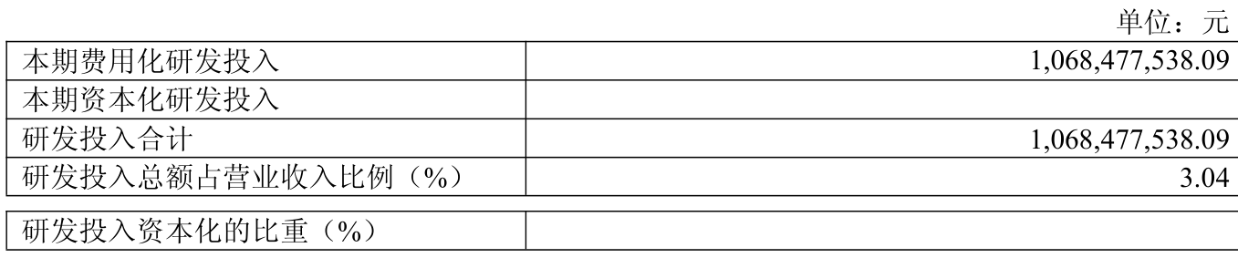 2024年全年,公司研发投入金额为10.68亿元,同比下降11.13%;研发投入占营业收入比例为3.04%,相比上年同期下降0.01个百分点。此外,公司全年研发投入资本化率为0%。