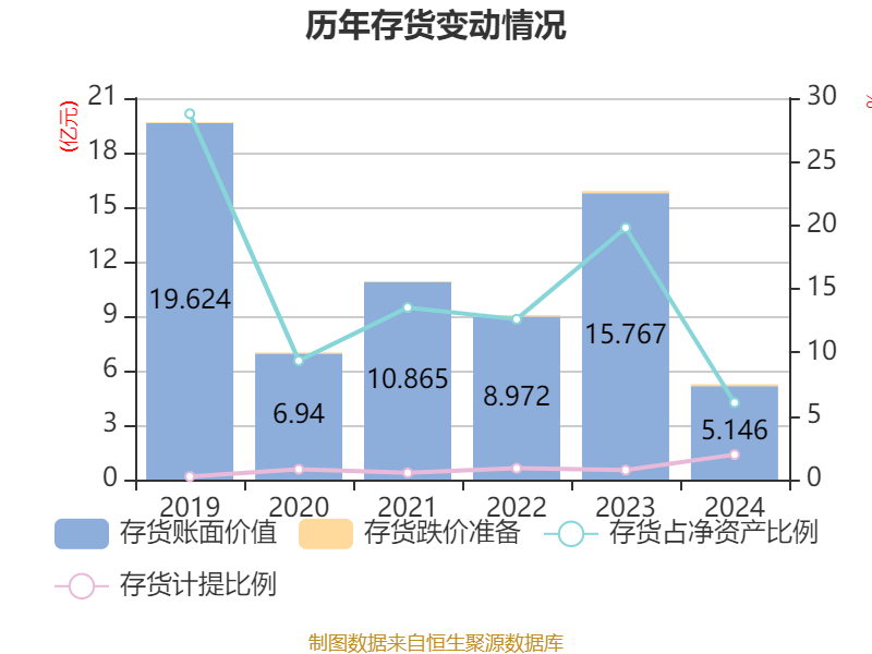从存货变动来看,截至2024年末,公司存货账面价值为5.15亿元,占净资产的6.05%,较上年末减少10.62亿元。其中,存货跌价准备为1026.27万元,计提比例为1.96%。